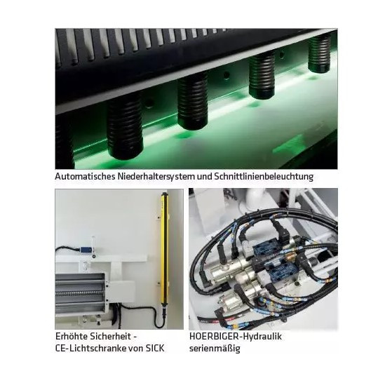 • Automatisches Niederhaltersystem mit hoher Haltekraft für Auflage- und Kippsicherheit während der Schnittphase